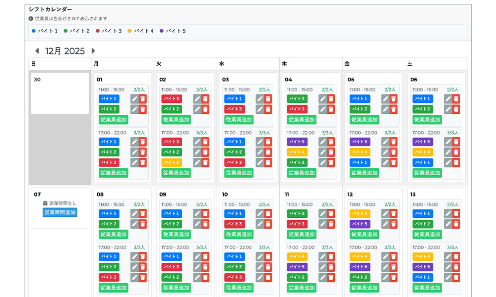 従業員の希望勤務日や勤務可能曜日を考慮し、最適なシフトを自動生成します。
