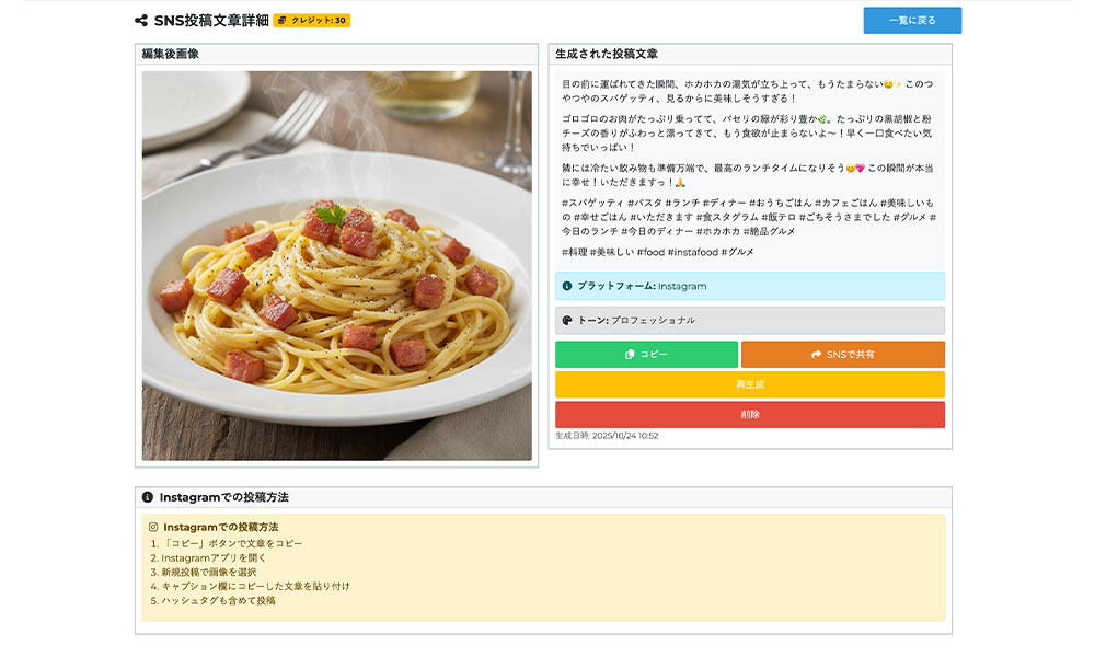 Instagram、Twitter、Facebookなど各プラットフォームに最適化された文章を自動生成します。